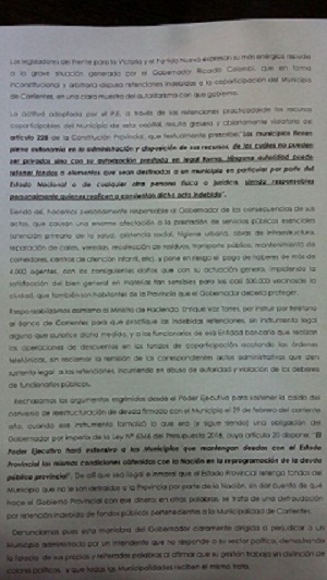Legisladores del FPV realizaron una conferencia de prensa en el hall de la Legislatura Provincial, donde expresaron su repudio por las retenciones que realiza el Gobierno de la Provincia a la comuna capitalina.