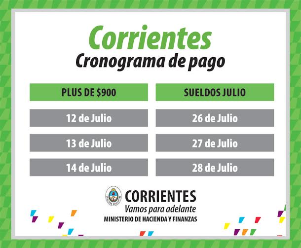 El ministro Vaz Torres informó que, por instrucción del gobernador Ricardo Colombi y articulación con el Banco de Corrientes S.A., el pago de los haberes de julio con el segundo tramo de la recomposición salarial, se liquidará en tres días, entre el 26 y 28 de este mes. En tanto que adelantó que el plus-adicional de $900 se abonará entre el 12 y 14 próximo.