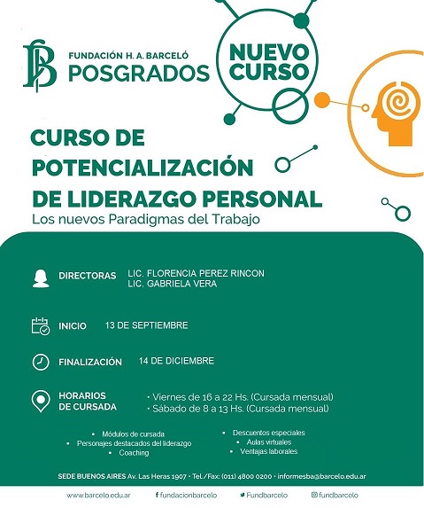 Fundación Barceló anuncia la apertura de las inscripciones para cursar en Sede Buenos Aires, el Posgrado de Potencialización de Liderazgo Personal. Que inicia el 13 de septiembre.