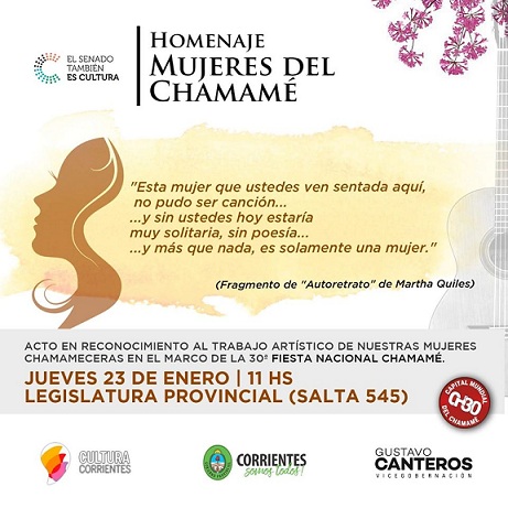 Canteros hizo extensiva la invitación a todas las mujeres que suman al crecimiento de nuestra música. “Estoy convencido de que su contribución al chamamé debe ser reconocida, y por ello espero que todas se unan a esta merecida distinción que haremos el jueves 23 de enero, en la Legislatura Provincial, con el objetivo de poner en valor el legado que han hecho a lo largo de la historia a nuestra música”.