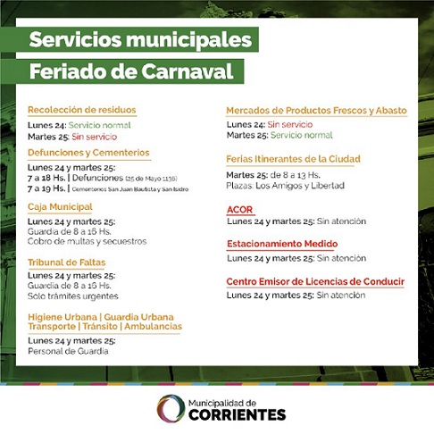 La Municipalidad de la Ciudad de Corrientes informa acerca del funcionamiento de los servicios que habitualmente prestan sus distintas dependencias a raíz del feriado nacional de Carnaval del lunes 24 y martes 25 de este mes.