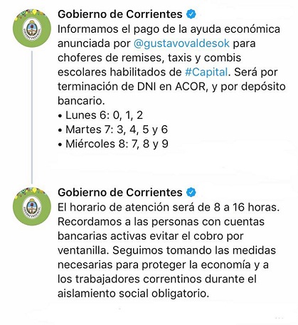 El Gobierno provincial ya transfirió los fondos para el subsidio que cobrarán los remises, taxis y transportes escolares de la ciudad de Corrientes, según lo resuelto y anunciado oportunamente por el gobernador Gustavo Valdés en el marco de las medidas económicas por la emergencia sanitaria declarada ante la pandemia del coronavirus y el dengue. Cobrarán desde este lunes según terminación de DNI en la Agencia Correntina de Recaudación (ACOR), ubicada en La Paz 2440, para quienes no tengan caja de ahorro.