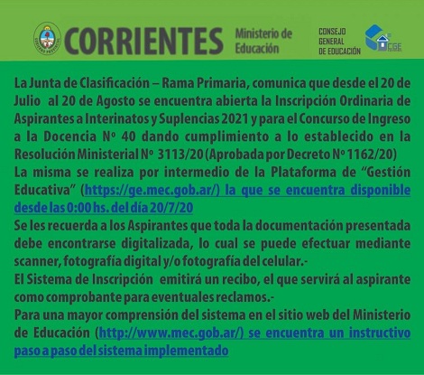 La junta de Clasificación- Rama primaria, informa que se desde 20 de julio al 20 de agosto se encuentra abierta la inscripción ordinaria de aspirantes a interinatos, suplencias y el concurso para ingreso a la docencia.Viernes, 17 de julio de 2020