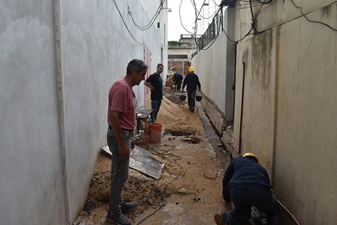 Asimismo tras la demolición de caños de bajada cloacal, se procede a la instalación de nuevo tendido así como de cañería de agua a nuevo. También se refaccionan las paredes con humedad en el depósito de planta baja y oficina del primer piso de sector norte y de la oficina del director en primer piso, baños y la oficina del tercer piso.