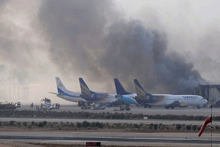 El comando de trece atacantes entró en el aeropuerto Mohamed Alí Jinnah de Karachi poco antes de la medianoche ataviados con uniformes de la guardia aeroportuaria y poco después abrieron fuego y empezaron a lanzar granadas.