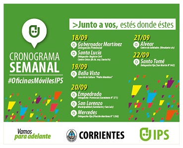 Información General | En la continuidad del trabajo en terreno, la Interventora del Instituto de Previsión Social Lorena Lazaroff, determinó el cronograma de oficinas móviles para esta semana que arrancarán este lunes en la localidad de Gobernador Martínez y Santa Lucía. Serán en total ocho localidades visitadas durante el transcurso de estos días para la realización de trámites libres y gratuitos.