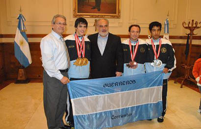 Política | Ricardo Colombi recibió a los deportistas correntinos que descollaron en la competencia ecuménica desarrollada en Otawa. Lautaro Romero del Castillo se consagró campeón mundial juvenil, Iván Pereyra fue segundo en su categoría y Ariel Ibarra se ubicó en el tercer lugar del podio, todos en la modalidad de Lucha.