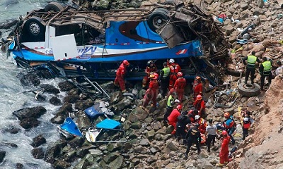 Internacionales | El siniestro ocurrió en un lugar conocido como "la curva del diablo". Al menos 25 muertos y siete heridos deja hasta ahora la caída de un autobús a un abismo en el departamento de Lima, confirmó hoy el jefe de la Policía de carreteras, Dino Escudero.