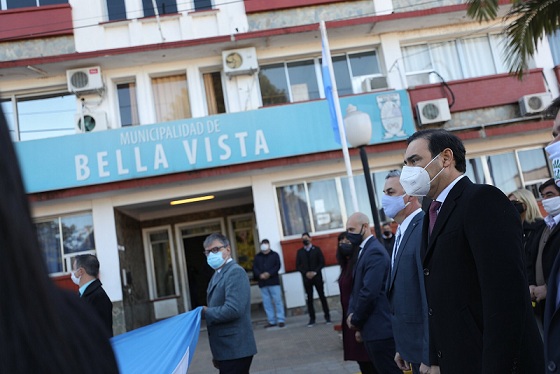 Interior | En el marco de la recorrida que se encuentra realizando el gobernador, Gustavo Valdés por algunas localidades del interior se dirigió para visitar Colonia Liebig una de las comunas de la Costa del río Uruguay al norte y con los cuidados pertinentes por la pandemia del Coronavirus COVID 19 que azota al mundo, aprovechó la ocasión en el día de su 96° aniversario de fundación para entregar 10 viviendas, inaugurar un Centro de Control Policial, recorrer obras y visitar la planta de ARCOR.