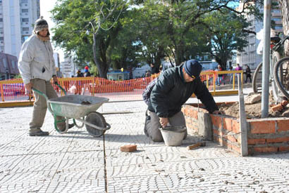 Política | Esta mañana se inició la colocación de losetas en el sendero diagonal ubicado por Santa Fe, casi Junín. Además continuaron las tareas de desmonte, movimiento de suelo y construcción de canteros.