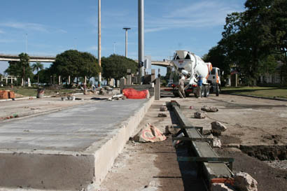Política | Esta mañana, los trabajadores avanzaron en la colocación del piso estampado en la base del monumento y en el revestimiento de los paramentos. Además, se construyen cordones en el cruce vehicular que se abrió para agilizar el tránsito.