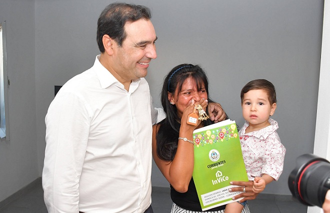 Interior | El gobernador Gustavo Valdés entregó 100 viviendas en el barrio Aeroclub de la ciudad de Goya, valorando la familia como núcleo básico de la sociedad. “Lo más importante que tiene la sociedad es la familia”, dijo allí el Mandatario junto al intendente local, Ignacio Osella y anunció la construcción de otras 50 unidades habitacionales más en la localidad, ratificando a la vez su compromiso de “hacer juntos una hermosa ciudad”.