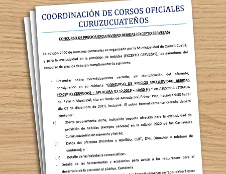Interior | La Municipalidad de Curuzú Cuatiá, a través de la Coordinación de corsos oficiales curuzucuateños, hace conocer a la ciudadanía la apertura y bases de concurso de precios para la explotación de bebidas, excepto cervezas, nieve artificial para cotillón, cantinas y cantinas VIP, para la edición 2020 de los corsos oficiales organizados por la Comuna curuzucuateña.