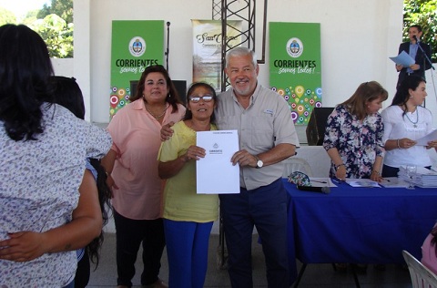 Interior | El ministro de Producción, Ing. Jorge Vara, presidió en San Cosme el acto de entrega de subsidios, planos de mensura y firma de títulos para casi 160 beneficiarios que quedaron más cerca de la titularización definitiva de las tierras que habitan. Durante la ceremonia, el titular de la cartera productiva anunció la decisión de la Provincia de avanzar en las tramitaciones para 70 familias más, lo que convertiría a esta jurisdicción en la plaza más intervenida del territorio correntino.