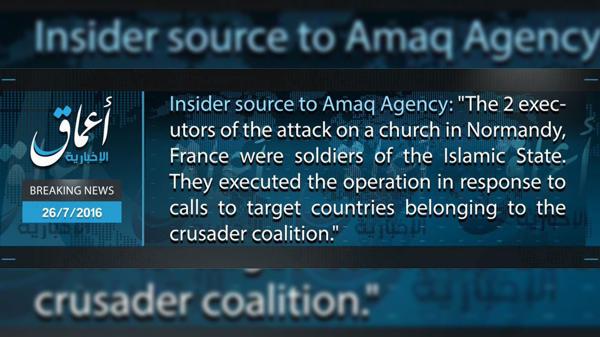 Internacionales | Los atacantes “respondieron al llamado” del ISIS a atentar contra países de la “coalición de cruzados” liderada por EEUU, señaló la agencia yihadista Amaq. El ataque se produjo en una iglesia de Normandía. El grupo terrorista Estado Islámico (ISIS, por sus siglas en inglés) se atribuyó, en un comunicado difundido por la agencia yihadista Amaq, el atentado perpetrado este martes contra una iglesia de la localidad de Saint-Etienne-du-Rouvray, en el noroeste de Francia.