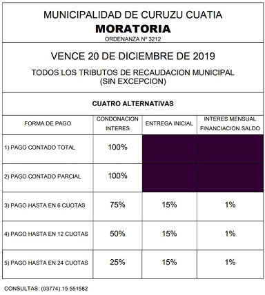 Interior | La Municipalidad de Curuzú Cuatiá, a través del proyecto del Ejecutivo Municipal, aprobado recientemente por el Honorable Concejo Deliberante, lanzó en las últimas horas un régimen especial de regularización y de facilidades de pago por tasas o tributos municipales.