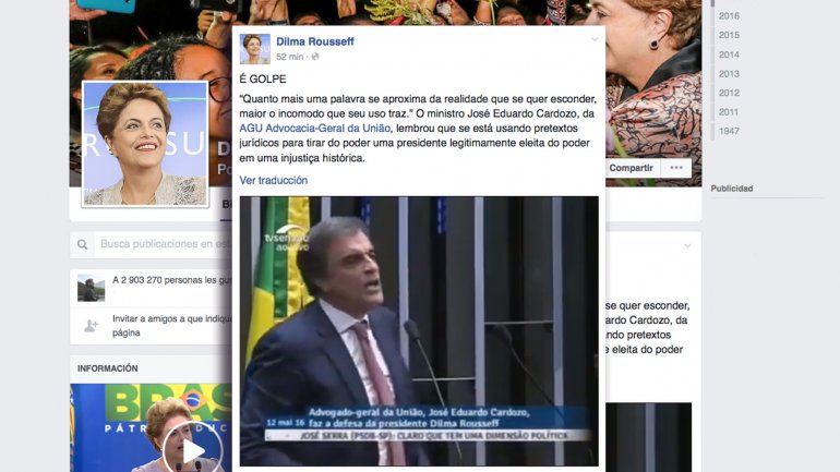 Internacionales | "Es un golpe. Cuanto más una palabra se acerca a la realidad que se quiere esconder, mayor es la incomodidad que su uso trae. El ministro José Eduardo Cardozo recordó que se están usando pretextos jurídicos para sacar del poder a una presidente legítimamente electa en una injusticia histórica", expresó Dilma Rousseff en su cuenta de Facebook. La jefa de Estado fue apartada este jueves del Gobierno de Brasil, al final de una sesión histórica en la que una gran mayoría del Senado votó a favor de iniciarle un juicio de destitución. DILMA HABLÓ DE "INJUSTICIA HISTÓRICA" La salida de Rousseff de la presidencia marca el fin a los más de 13 años del izquierdista Partido de los Trabajadores (PT) en el poder del gigante sudamericano.