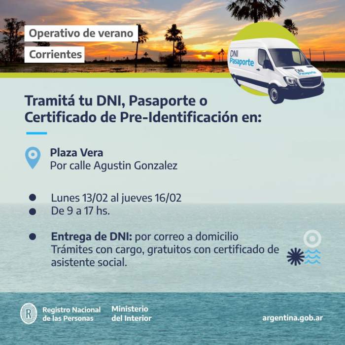 Información General | Los operativos de verano serán de 9 a 17 con 120 turnos diarios por orden de llegada. Se realizará en Costanera sur y General Paz los días sábado 11 y domingo 12 de febrero. Mientras que desde el lunes 13 hasta el jueves 16 se atenderá en Plaza Vera. Se podrá tramitar DNI, Pasaporte y Certificado de Pre Identificación.