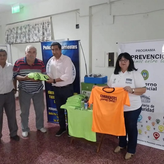 Información General | Acompañando al ministro de Seguridad, Buenaventura Duarte, el programa “La Prevención la Hacemos entre Todos”, dependiente de dicha cartera, visitó la sede social del Círculo de Suboficiales y Agentes de la Policía de Corrientes, oportunidad en la cual desplegó la entrega de indumentaria deportiva consistente en camisetas y shorts, además de kits de sanitización, a más de 30 efectivos policiales que forman parte de los equipos de fútbol en categoría Libres y Veteranos.