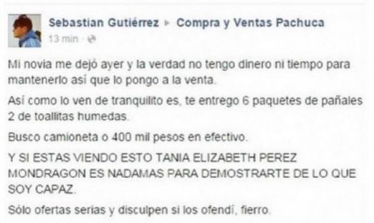 Internacionales | En Internet se puede ver de todo. Esta vez, un chico de 25 años publicó un mensaje en Facebook donde aseguraba que quería vender a su hijo por US$26.000 o cambiarlo por una camioneta.