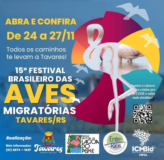 Información General | Con el turismo de naturaleza como epicentro y punto de encuentro de especialistas en el mundo del avistaje de aves, modalidad en crecimiento en todo el mundo, se desarrollará del 24 al 27 de noviembre la edición número 15 del Festival de las Aves Migratorias. La ciudad de Tavares situada en Río Grande do Sul BR convocará a los máximos exponentes de este concepto de la actividad turística que en los últimos años despertó gran interés en los visitantes.