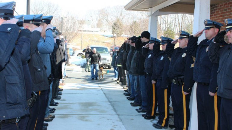Internacionales | Más de 30 oficiales formaron un cordón de honor para acompañar a Juez, un pastor alemán de 9 años afectado por una enfermedad terminal. El animal desfiló con su juguete favorito en la boca