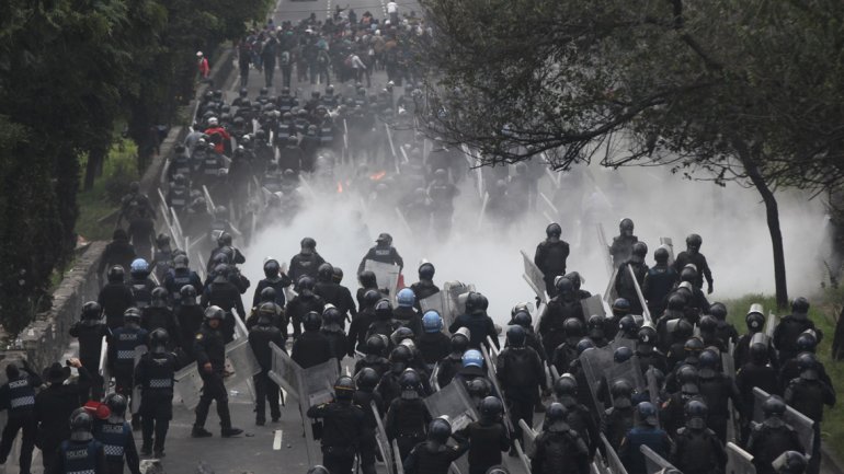 Internacionales | Un grupo de encapuchados se enfrentó con agentes antidisturbios en el DF, tras una marcha masiva para protestar por la desaparición de los jóvenes en Iguala. Los efectivos lanzaron gases lacrimógenos. Imágenes de la televisión local mostraban a algunos manifestantes arrojando objetos en llamas y golpeando con palos los escudos de los policías, que se alineaban frente al Palacio Nacional, sede de la Secretaría de Hacienda y de actos oficiales del Gobierno del presidente Enrique Peña Nieto.