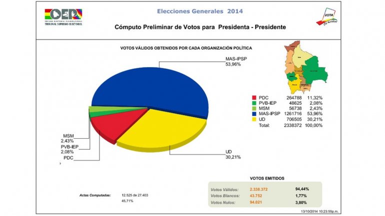 Internacionales | El escrutinio oficial de las elecciones del domingo en Bolivia confirmó la reelección en primera vuelta del presidente, aunque cinco puntos por debajo del 60 por ciento de los votos que le atribuyeron encuestas privadas a boca de urna, y mantenía la incógnita sobre si el oficialismo ganará el control de los dos tercios del parlamento. Con 62,60 por ciento del recuento oficial completado hasta la media tarde de este martes, Morales obtenía 55,18 por ciento de los votos válidos, seguido por el empresario conservador Samuel Doria Medina (28,16 por ciento) y el ex presidente democristiano Jorge "Tuto" Quiroga (10,94 por ciento), según datos publicados por el Tribunal Supremo Electoral (TSE) en su sitio web.
