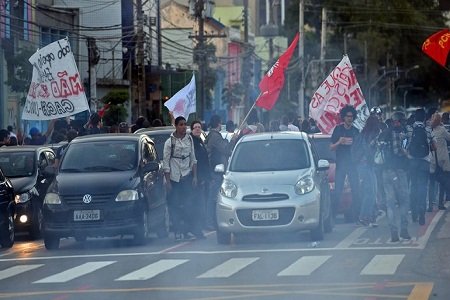 Internacionales | Los trabajadores decidieron no acatar un fallo judicial que declaró ilegal la paralización de los servicios, que ya cumple cinco días. El metro es fundamental para llegar al Arena Corinthians, estadio inaugural de la Copa. Los trabajadores en huelga se manifestaron esta madrugada ante la estación Ana Rosa e intentaron bloquear el tránsito por una importante calle aledaña con hogueras que alimentaron con basura y madera.