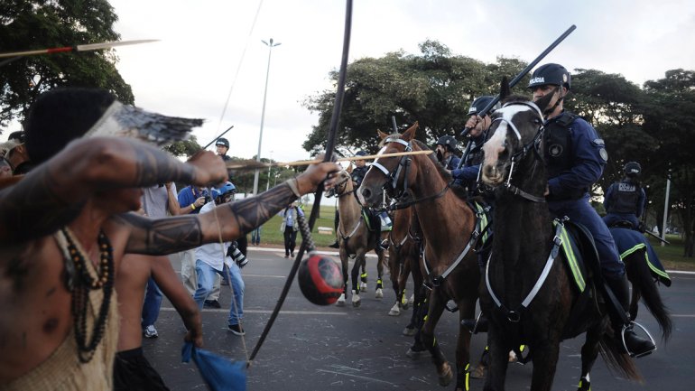 Internacionales | Los agentes reprimieron con gases lacrimógenos y ellos respondieron con sus armas tradicionales. Un oficial debió ser operado para extraerle la punta que tenía clavada. La policía dispersó el martes con gases lacrimógenos una manifestación pacífica contra el Mundial-2014 protagonizada por indígenas y miembros de movimientos sociales que pretendían llegar al estadio mundialista de Brasilia, donde se disputarán varios juegos de la Copa y desde este martes se exhibía el trofeo.