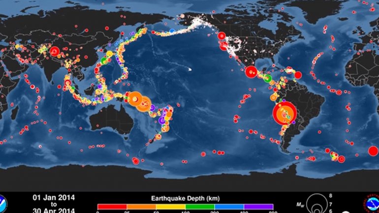 Internacionales | Según el Centro de Alerta de Tsunamis del Pacífico (PTWC) ocurrieron 13 fenómenos sísmicos, de los cuales cinco fueron superiores a 7,8 grados de magnitud. Un video elaborado por el PTWC reproduce la situación sísmica en el mundo hora por hora desde el mes de enero hasta abril de 2014. El análisis realizado por el organismo revela que el mes pasado fue el que registró mayor cantidad de terremotos en lo que va del año, con un total de 13.