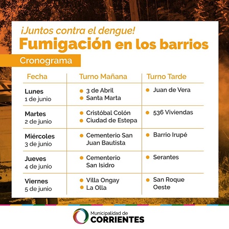 Policiales | La próxima semana, la fumigación llegará a los barrios 3 de Abril, Santa Marta, Cristóbal Colón, Ciudad de Estepa, Irupé, Juan de Vera, Serantes, 536 Viviendas (norte y Sur), Ongay, La Olla y San Roque Oeste; además de los cementerios San Juan Bautista y San Isidro en Laguna Brava. Se trata de una de las tantas acciones que encara la Municipalidad en el marco de su lucha contra el dengue.