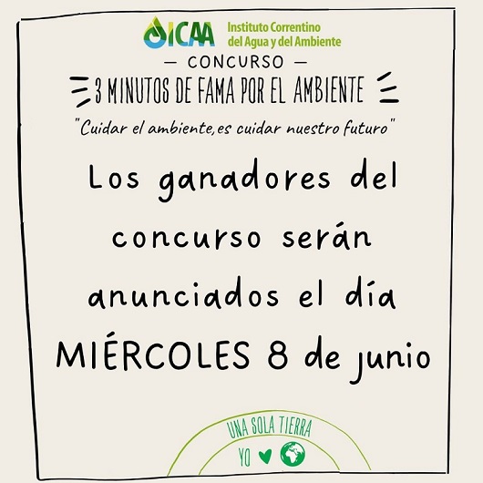 Información General | El Instituto Correntino del Agua y del Ambiente (ICAA) informó que el anuncio de los ganadores del Concurso “Tres minutos de Fama por el Ambiente” será dado a conocer el próximo miércoles 8 de junio a través de su sitio web y redes sociales.