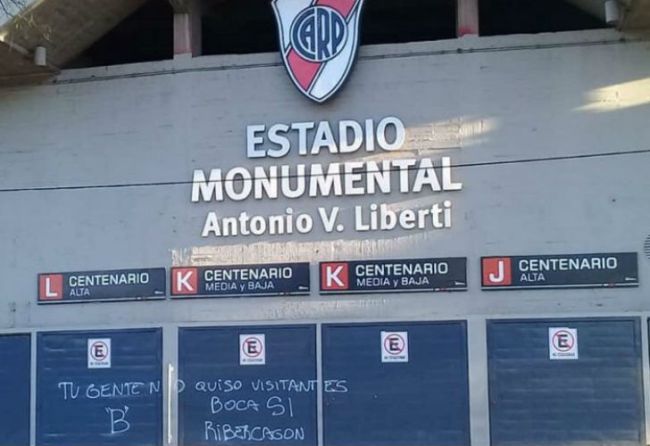 Deportes | Hinchas xeneizes le dejaron un mensaje a sus rivales en una de las puertas del estadio millonario. “Tu gente no quiso visitantes”, acusan. El sábado se juega el primer partido.