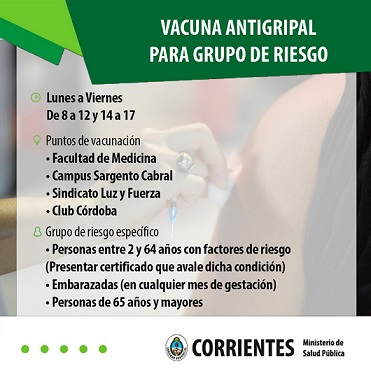 Información General | De esta manera la Campaña Antigripal continúa de 8 a 12 y de 14 a 17 en los cuatro puntos destinados en Capital: Facultad de Medicina, Campus Sargento Cabral, Sindicato de Luz y Fuerza y Club Córdoba. Para el interior, ya inició la distribución de las dosis para ser aplicadas articuladamente con los hospitales locales.