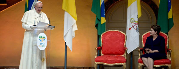 Internacionales | Francisco dirigió sus primeras palabras desde el Palacio Guanabara de Río de Janeiro. En Brasil, encabezará la Jornada Mundial para la Juventud. Antes, habló Dilma Rousseff:"Luchamos contra un enemigo común, la desigualdad". "Pido permiso para entrar y pasar esta semana con ustedes. No tengo oro ni plata, pero traigo conmigo lo más valioso que se me ha dado: Jesucristo. Vengo en su nombre para alimentar la llama de amor fraterno que arde en todo corazón; y deseo que llegue a todos y a cada uno mi saludo: 'La paz de Cristo esté con ustedes'", afirmó Francisco en su primera intervención en Brasil.