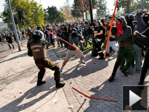 Internacionales | Un grupo menor se apartó de la convocatoria pacífica, que reunió 45.000 manifestantes contra el lucro, y enfrentó a los Carabineros. Gases lacrimógenos lograron la dispersión total. Un grupo de encapuchados produjo violentos enfrentamientos contra los Carabineros este jueves en el centro de Santiago, al término de una nueva marcha de estudiantes que exigen reformar el sistema educativo. Autoridades registraron la asistencia de 45.000 manifestantes.