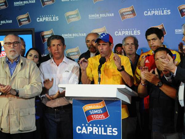 Internacionales | “Nosotros tenemos un resultado distinto”, dijo el candidato de la oposición. Habló después del discurso del candidato oficialista, al que consideró "el único derrotado". Exigió que se audite el 100% de los votos. El candidato de la Mesa de Unidad Democrática, Henrique Capriles, compareció ante los venezolanos para ratificar que su partido no reconocerá la derrota y exigirá el conteo voto por voto. Se presentó con las 3200 incidencias observadas por el CNE, que serían la diferencia suficiente que favorece los resultados que la oposición manejaba.