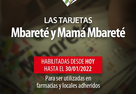 Información General | El Gobierno provincial, a través del Ministerio de Salud Pública comunica que las tarjetas Mbareté y Mamá Mbareté se encuentran habilitadas hasta el 30 de enero inclusive, para ser utilizadas por los beneficiarios de las mismas.