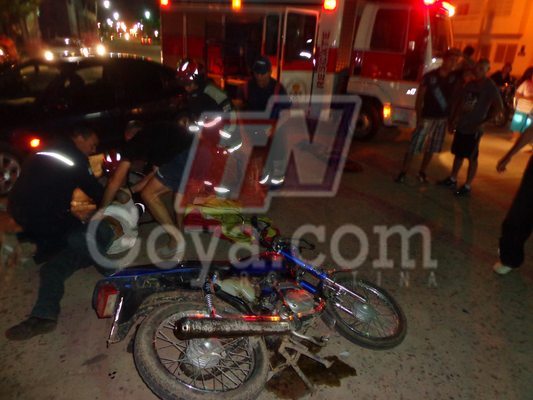 Interior | Pasadas las 20:30 hs en la noche del jueves ocurrio un accidente vial en la interseccion de Av. Sarmiento y Tucuman, donde por razones que se tratan de establecer una motocicleta 100 c.c guiado por Ricardo Villegas Villegas resulto con serias heridas al caer en el pavimento al embestir con una moto Zanella de 50 c.c conducido por Ismael Falcon.
