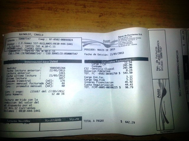 Interior | Una familia de apellido Raynoldi, del barrio 9 de julio, recibió la boleta de agua con el tarifazo incluido, donde el monto pagar es de $642.