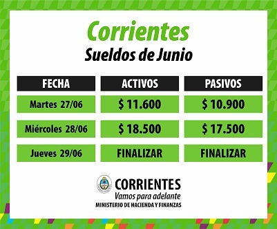 Política | El jefe de la cartera económica correntina, Enrique Vaz Torres, confirmó que el inicio del cronograma de pago de la Provincia, en articulación con el Banco de Corrientes S.A., será el martes 27, día en que cobrarán los activos hasta $11.600, y los pasivos hasta $10.900; informó que continuará el miércoles 28, abonando hasta $18.500 a trabajadores en actividad y hasta $17.500 jubilados y pensionados; finalizará la liquidación el jueves 29 de este mes para ambos sectores. El Ministro también adelantó que el Gobierno Provincial alista la ejecución de nuevos aumentos en julio próximo.