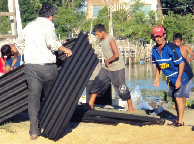 Interior | El concejal Ariel Pereira entrego chapas que fueron enviadas por Camau Espínola para que las familias evacuadas del barrio el Chacal, puedan hacer sus refugios hasta que el agua baje y puedan volver a sus domicilios. “La situación es realmente compleja hay muchos niños que necesitan atención medica, discapacitados que no quieren dejar sus casas y el clima no ayuda, es necesario que todos seamos solidarios con los que menos tienen”, dijo Pereira.