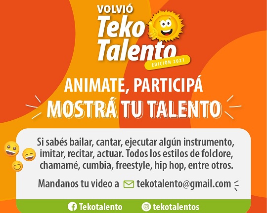 Información General | Desde el 15 de marzo hasta el 15 de abril, los interesados en participar de esta propuesta encarada por la Subsecretaria General de la Gobernación deben enviar su material audiovisual a tekotalento@gmail.com.