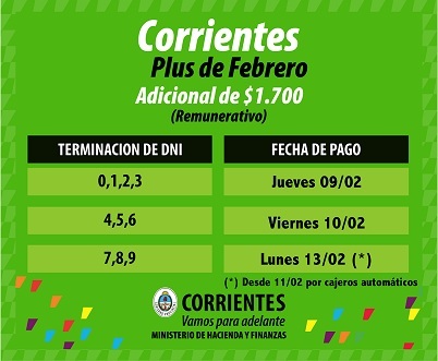 Política | El ministro de Hacienda y Finanzas, Enrique Vaz Torres, confirmó el inicio del cronograma de pago del adicional del mes de febrero para los agentes públicos de la Provincia. El plus de $1.700 comenzará abonarse desde el 9 para documentos terminados en 0-1-2-3; el viernes 10 a DNI finalizados en 4-5-6; y el lunes 13 a los agentes con documentos terminados en 7-8-9 (estará disponible por cajeros desde el sábado 11). En pocas semanas comenzarán las clases en Corrientes y sabemos que las familias tienen gastos extra que afrontar”, señaló el funcionario.