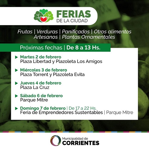 Información General | Los próximos días, los feriantes estarán en los puntos fijos tradicionales de los espacios públicos, en el horario de 8 a 13. Además, el domingo regresa la Feria de Emprendedores Sustentables en el parque Mitre, de 17 a 22.