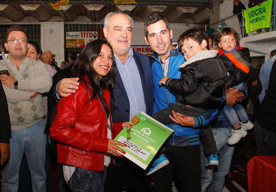 Política | El Mandatario Provincial encabezó hoy por la mañana el acto de entrega de cien viviendas para los habitantes de la ciudad de Goya, el evento se desarrolló en las cubiertas instalaciones del Club AGDA, en cuyas instalaciones colmadas, los adjudicatarios recibieron las carpetas que le otorgan la tenencia de las casas y las respectivas llaves.