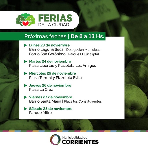 Información General | Los feriantes se ubicarán también como es habitual en las tradicionales plazas de la Ciudad, Libertad, Torrent y La Cruz, como así también en las plazoletas Los Amigos y Evita. Entre tanto, el sábado 28 se apostarán en el parque Mitre.