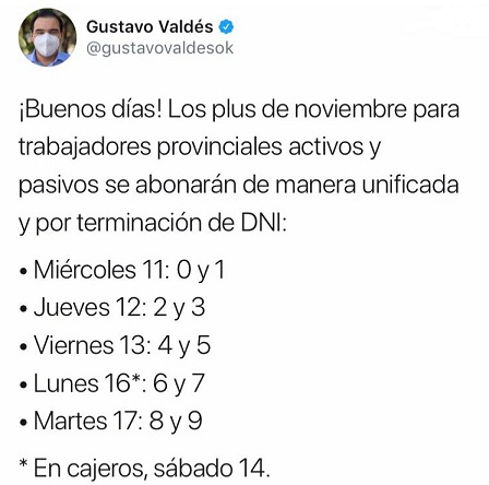 Información General | El gobernador Gustavo Valdés informó el pago de los plus de noviembre para trabajadores provinciales activos y pasivos, los cuales se abonarán de manera unificada y por terminación de DNI.
