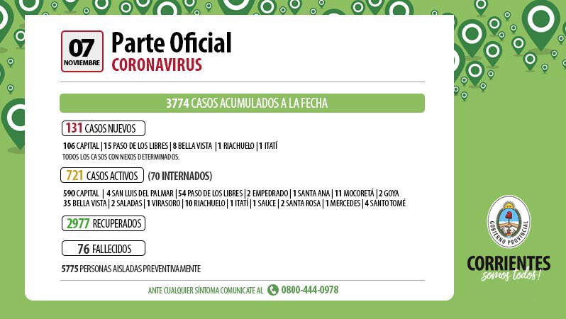 Información General | El informe epidemiológico de la Provincia dio cuenta que en las últimas 24 horas se produjeron 131 nuevos contagios de Coronavirus, 106 corresponden a residentes de Capital, 15 de Paso de los Libres, 8 Bella Vista, 1 Riachuelo y 1 Itatí, todos se encuentran aislados y cumpliendo el protocolo correspondiente.